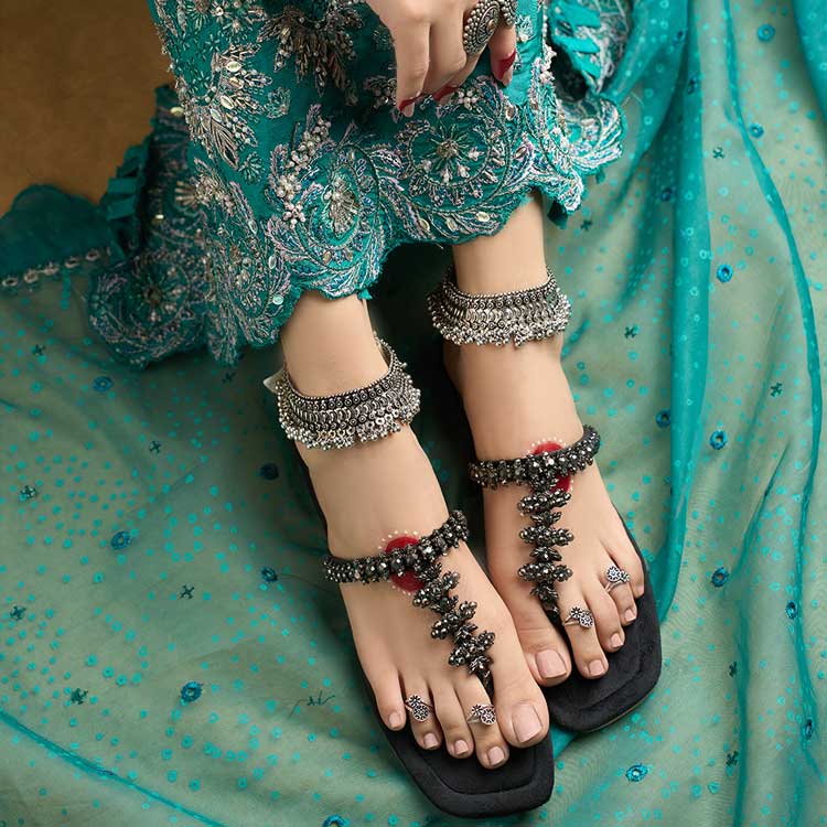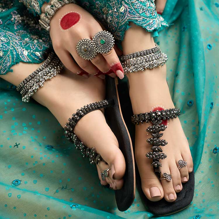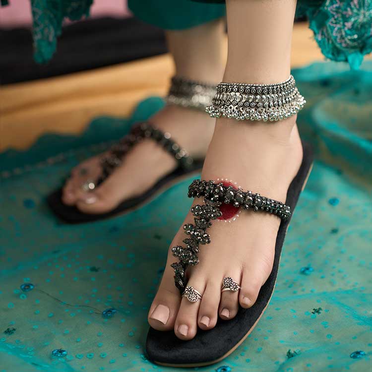 “Rajwada” pays tribute to Rajasthan’s rich legacy by combining tradition with striking elegance. This deep-black Kolhapuri, with its elaborate design and classic craftsmanship, captures the majesty of royalty. It is a multipurpose statement piece that goes well with both ethnic and modern ensembles because to the effortless elegance of Kolhapuri design and the rustic beauty of Rajasthani features.